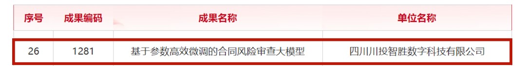 本次活动以“数据建模 赋智监管”为主题,围绕国资监管和企业管控共性问题,设立了12个赛道27个赛题。川投数科凭借自主研发的“基于参数高效微调的合同风险审查大模型”,从全国772个参赛模型作品中脱颖而出,获评“内部监督——风险识别预警”赛道“优秀成果”奖,成为四川省属国有企业中唯一获此荣誉的单位。